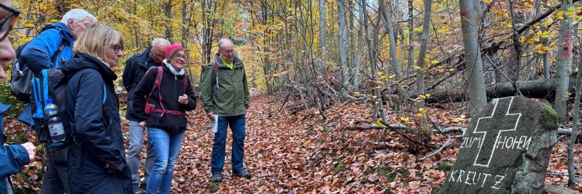 Über den Alten Kohlhof ging es zu den Steinen am (ehem.) Cedernwald und vorbei am Kleinen Rossbrunnen zum Krausstein. Letzterer zeichnet sich durch ein ganz spezielles Alleinstellungsmerkmal aus: er war der einzige der vielen Steine auf dieser Wanderung, zu dem Joachim Gerhard trotz intensiver Recherche keinen Hinweise auf Namensgeber oder Stifter gefunden hat. Ganz anders als beim Hettegerstein und beim Arnoldstein, die beide an das Schicksal verunglückter Waldarbeiter mahnen.